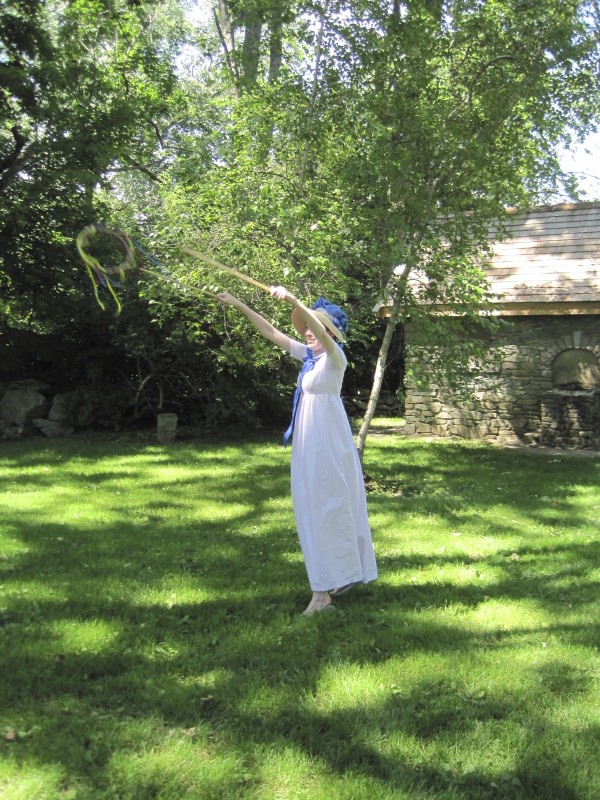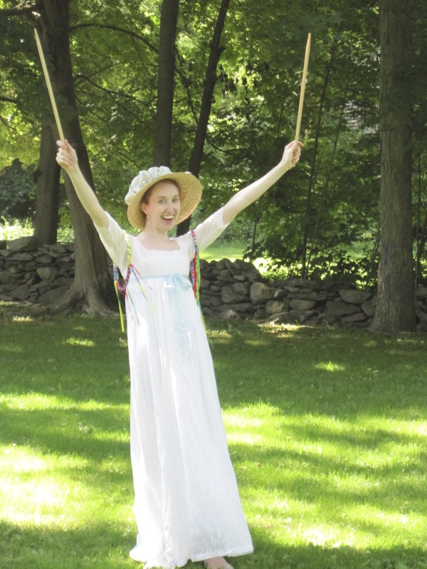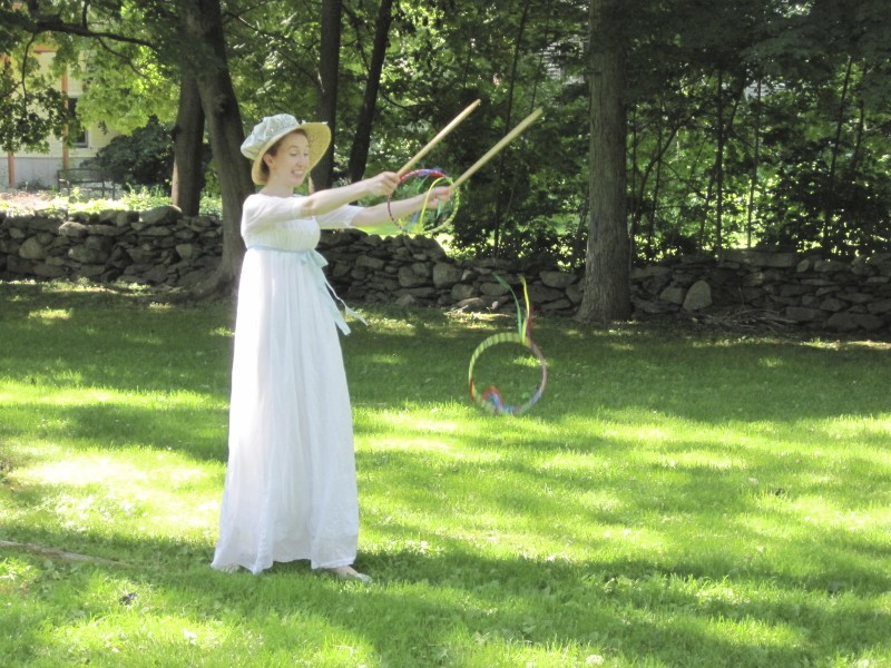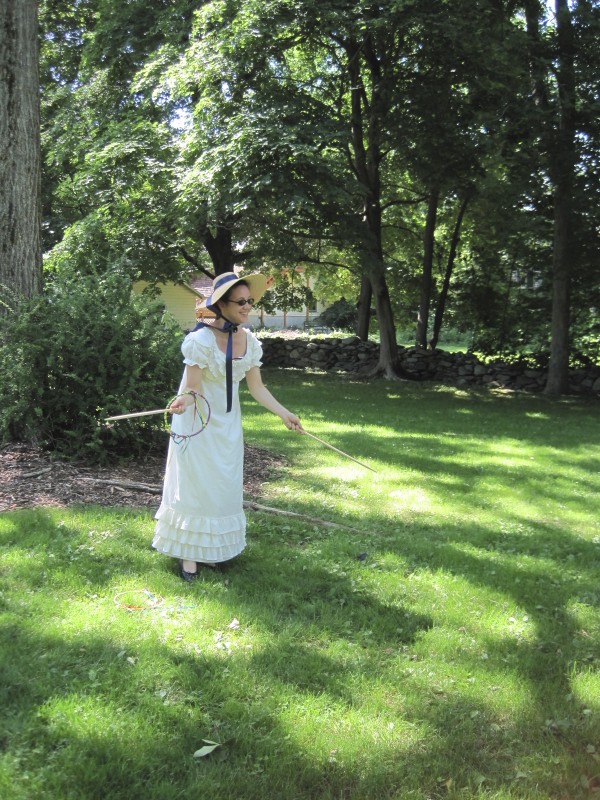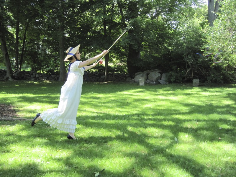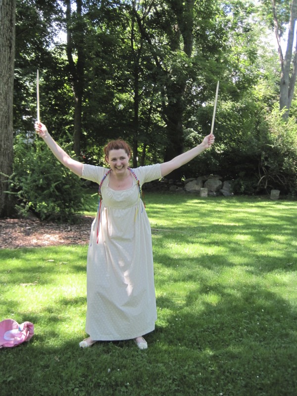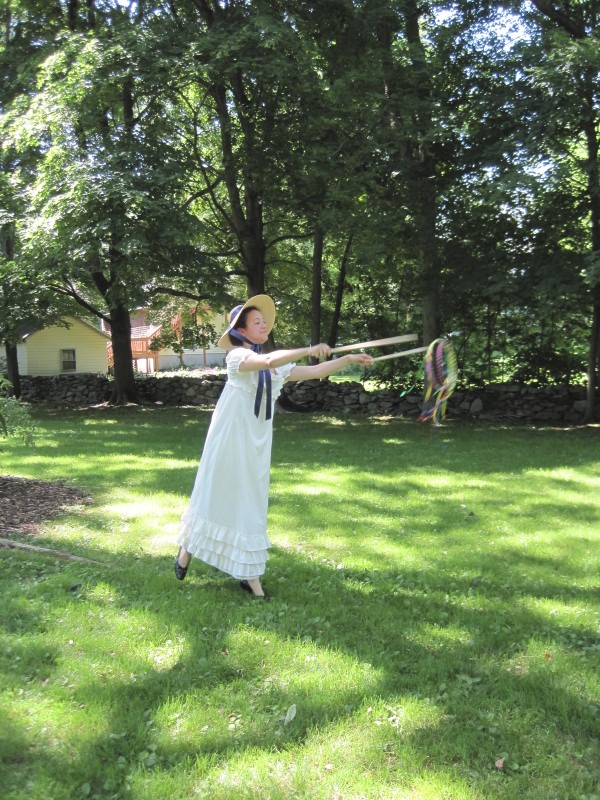 Our idyllic setting at a lovely park in Bridgewater, MA.Okay, so our food and table setting was not historically accurate. But the colors were so nice and summer-y! (And the pink lemonade was quite refreshing.)After eating, we strolled through the park and took pictures (and coerced random passers-by to take photos of us…). Lovely group of ladies, don’t you think?Then we played a Regency game called… “Graces?” (Ack! I can’t remember the name… Jenni, help me!)Basically, each person has two long sticks which they use to fling the be-ribboned hoops at the other player. The second person catches the hoops on their own sticks before flinging them back again.I’ve included pictures where you can see the hoops in midair. Despite the fact that we often seem to be catching the hoops, I also have many pictures where we, um, didn’t catch the hoops…Eventually, we got the hang of it and decided to make it more challenging. In this instance we had two hoops going at once, one flung by each player!It took a little time to get used to the coordination of flinging and catching in quick succession.But we got the hang of it and then we started flinging two hoops at the same time in one direction! That meant the person catching had to catch two at once! Eep!