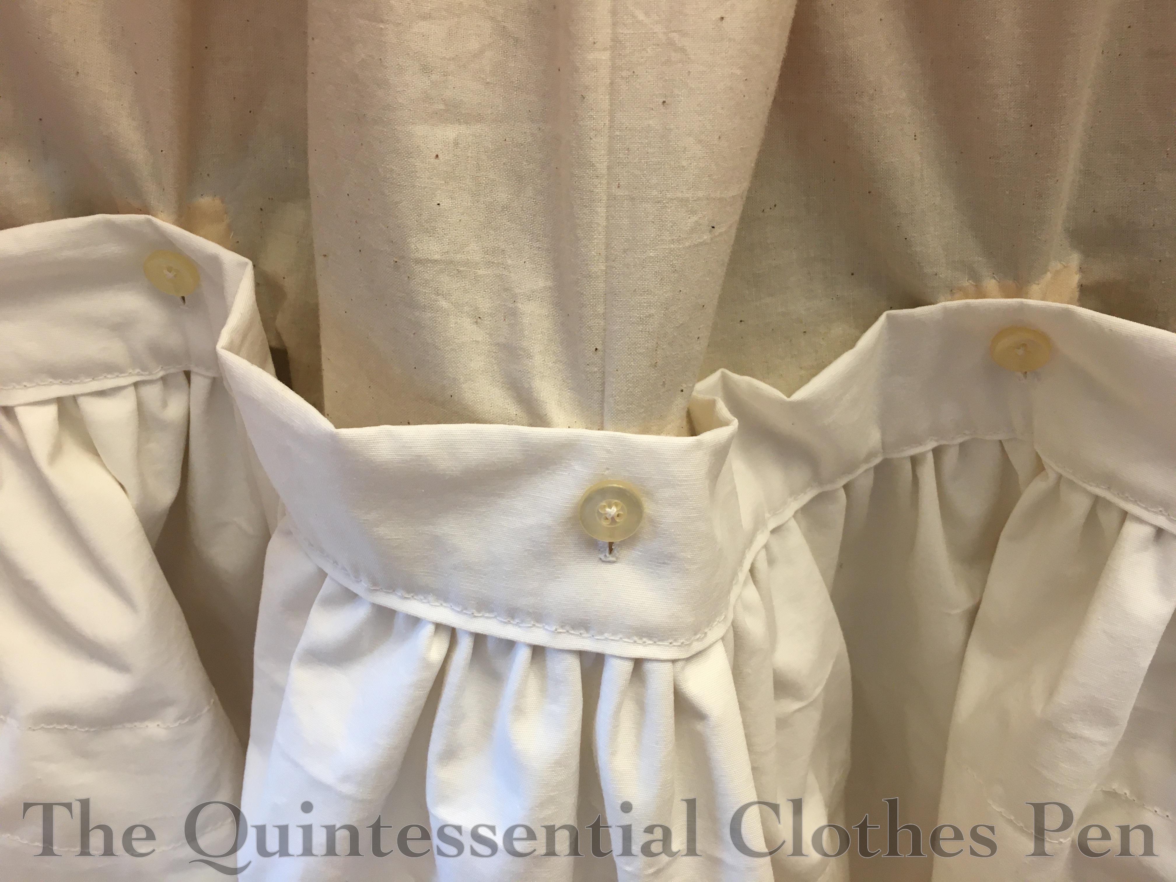 After that, the skirt drape hooks forward, covering the muslin layer completely (this is not done up in the photo below). This completely hides all of the previous closures. To help keep this layer of closures invisible, the hooks attach to thread bars instead of metal loops. You can make them out below if you take a close look.