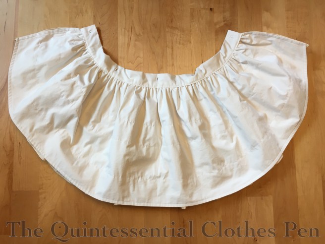 In order to be sturdy enough to attach all of the skirt layers, the waistband is flat lined with muslin and also encases a grosgrain ribbon. That adds a bit of bulk, but it also creates a very sturdy finished product and, again, you can’t see the bulk under the bodice.