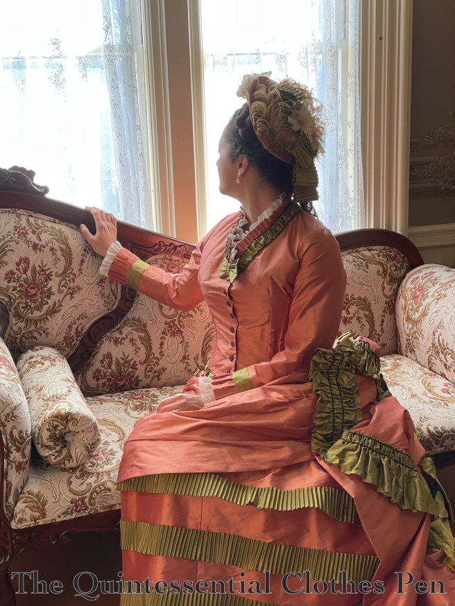 In the photo above, you might have noticed the rather bold pink organza showing on the back drape panel. That’s just a small portion of what’s actually back there–the entirety of the back panels are flat lined with this pink polyester organza. Polyester organza is not what they would have used in 1875. But other stiff, lightweight fabrics such as silk organza or cotton organdy would have been used to help the silk maintain pouf. I chose the pink because I had the perfect amount in my stash (and both it and the dress are shades of pink, so… it’s not that far off?).