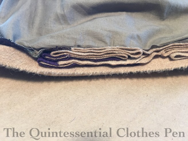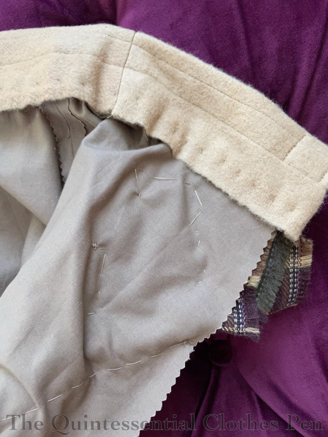I started with making the pleated neck swag, so I wouldn’t run out of fabric, and then used all of the leftover fabric to make the apron. Due to this fabric restriction, I patterned the apron based on what was possible with my fabric, using a general understanding of the how these skirt elements were patterned in this period. The front of the apron is a curved piece that is pleated into the back on each side. The back piece is a bit scant, but has a few pleats along the top to give volume and descends to a point at the center back, since that was the shape of the fabric that was available! I used up pretty much all of the blue velvet!