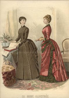 From the fashion plate below, published in the Revue de la Mode in February 1886, I pulled information from the gown on the right, with the pleated fabric along the v-shaped neckline and asymmetrical decorations (which I guess are feathers) on the shoulder and skirt.