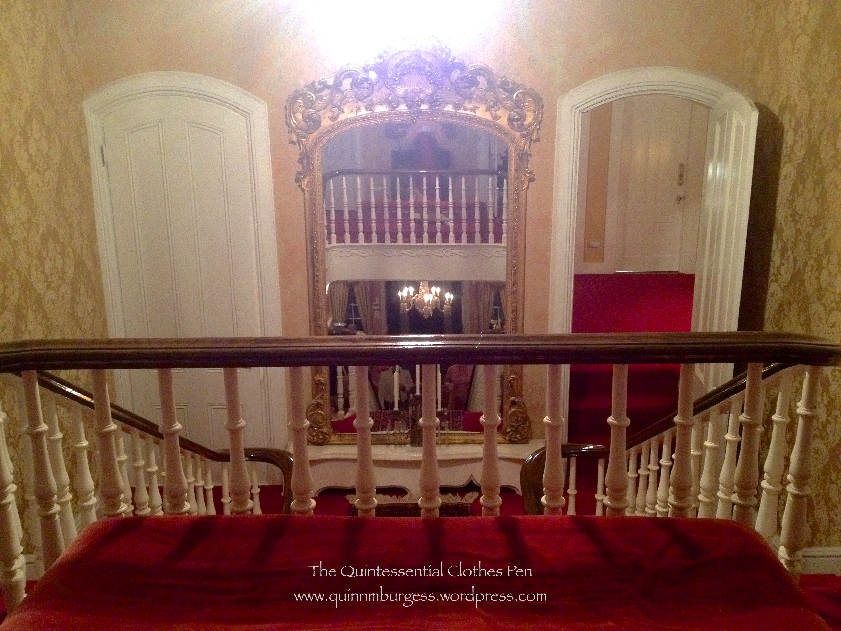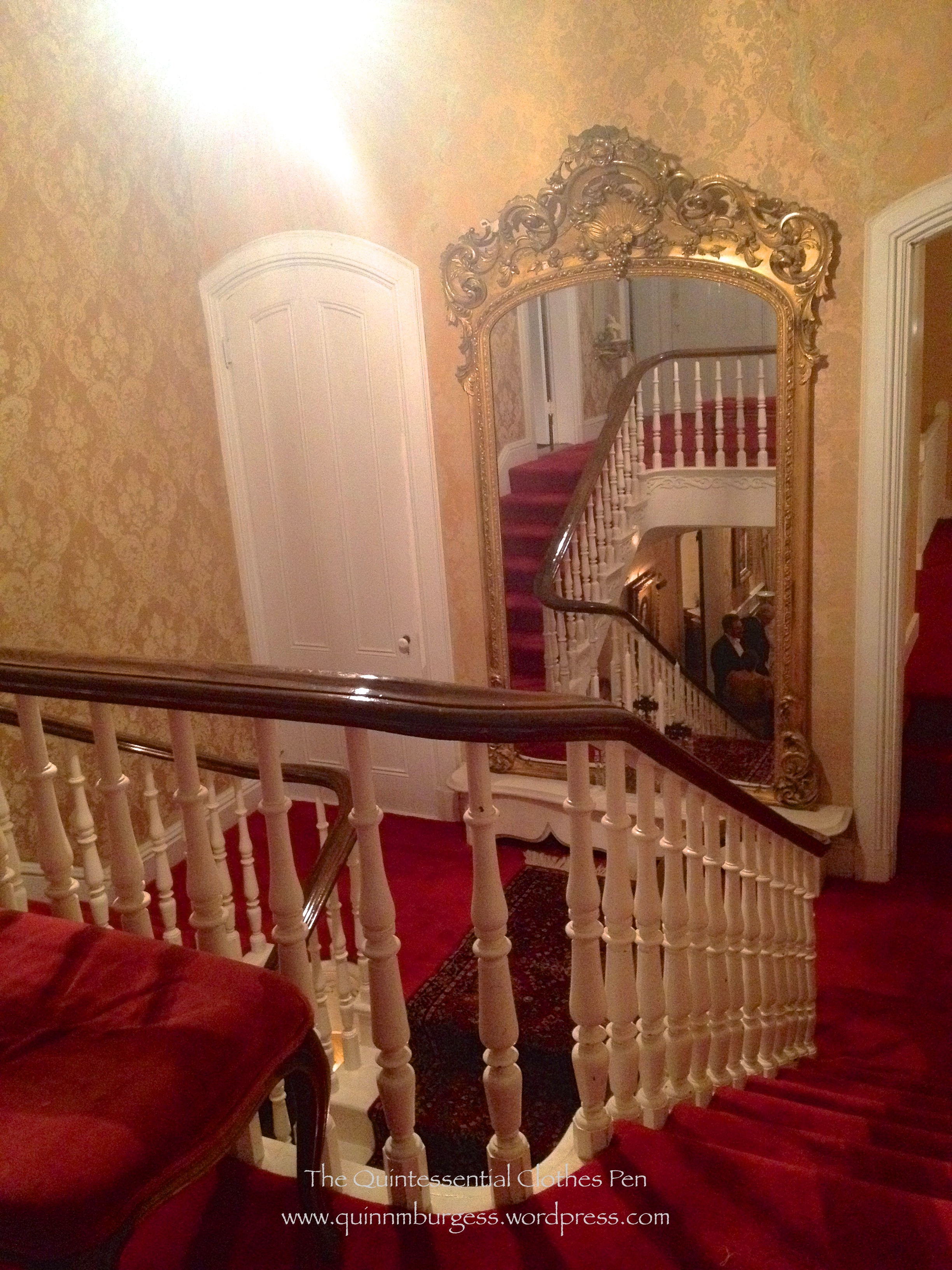 A lovely staircase in the front hall greets us, as is is typical of a mid-19 century home.Beautiful architectural details grace all aspects of the house: see the lovely gold damask wallpaper and the decorative woodwork along the stair moulding?At the top of the stairs there is another split set of stairs leading up to a cute balcony and bedrooms overlooking the ocean.Standing at the top of the balcony we can look into the fabulous tall mirror down the stairs into the hallway below.Back downstairs in the entrance hall we can appreciate another lovely mirror, beautiful fireplace, and elegant grandfather clock.Off to the opposite side of the hall from the fireplace is a small ballroom with a distinctive wood floor. Dancers whirled in small circles here all evening to the tune of live music.The ballroom’s walls were adorned with large pastoral paintings which sadly were peeling and in need of conservation. There was also this elegant sofa on one side. I love that the colors in these dresses complement each other so well and that the attitudes of each person are so distinctive and pretty.And here I am, wearing my burgundy and gold 1912 evening gown, which harmonized beautifully with the colors in the entry hall. See that wallpaper? I love it!