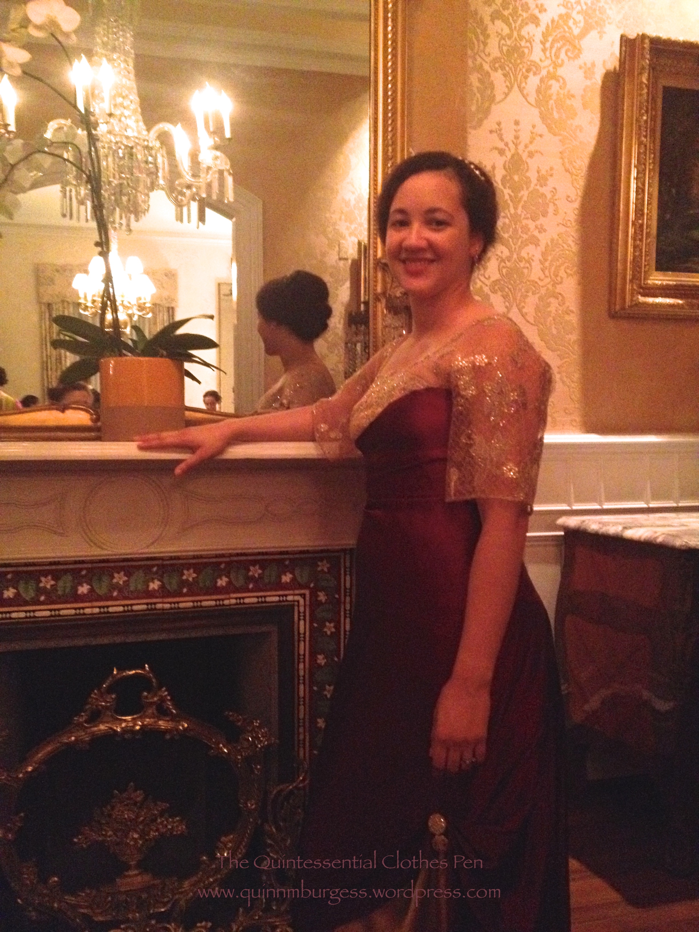 I call this dress the “Dowager Countess” gown because the shape of it reminds me of what Maggie Smith’s character in Downton Abbey often wears to dinner parties. Look at the bodices on these dresses: this dress, this dress, and this dress are all examples of a similar style–one that the Dowager Countess wears often! And why wouldn’t I want to be reminded of Maggie Smith when I think of this dress? Her snarky comments are highlights of Downton Abbey! (Incidentally, one of my friends wore the just-emerging-in-the-1910s style of pants in the ballroom to this ball–gasp!–and we took some posed snarky pictures. Head over to her blog, Plaid Petticoats, to take a look at her scandalous outfit. When you get to the bottom you’ll find the snarky pictures. You might even find that you think I’m there twice, because I was wearing this new 1910 dress and I loaned my 1912 evening gown from 2012 to a friend who happens to be being snarky with me.)