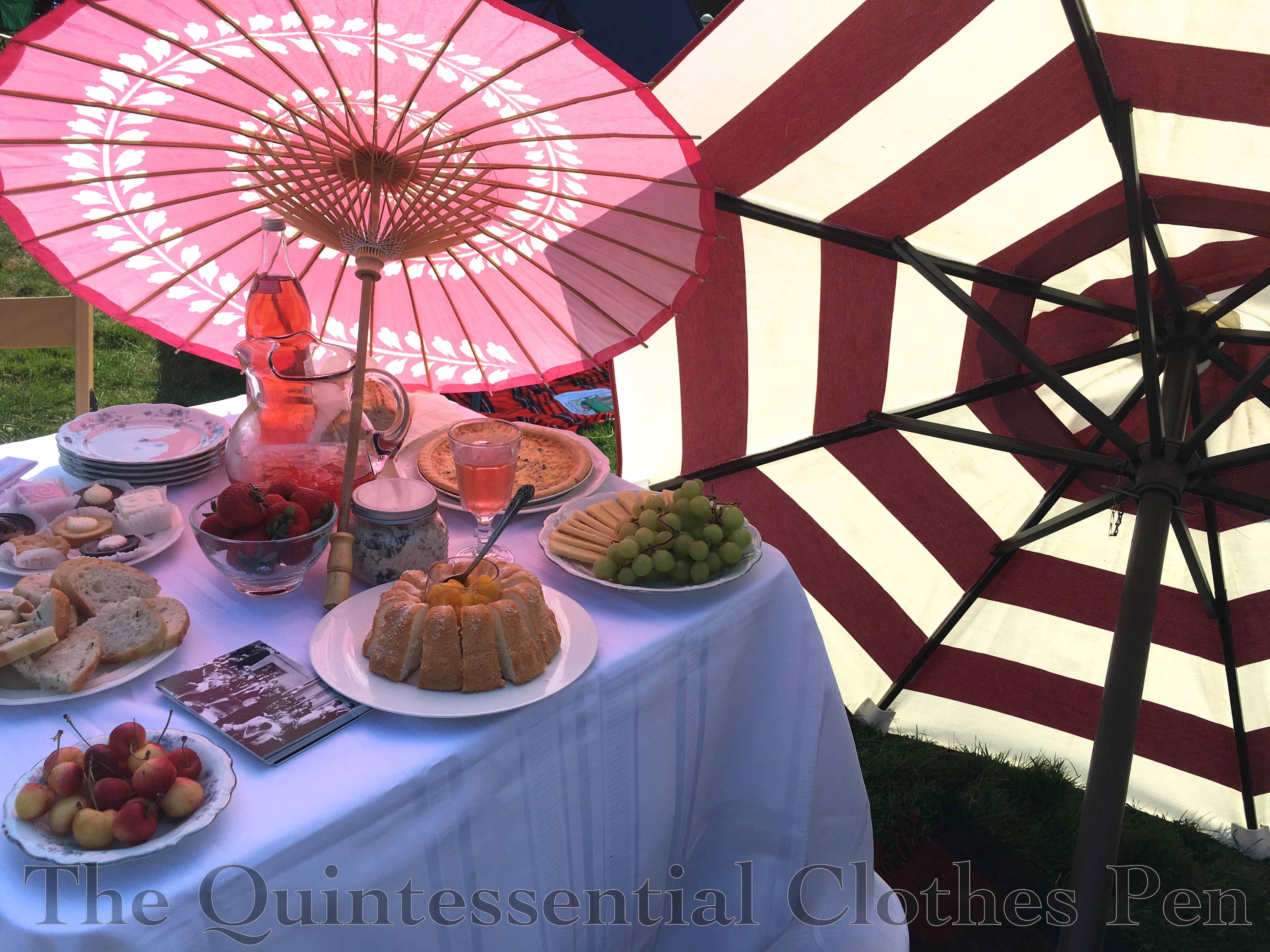 I recently shared photos of my 1925 Blue Coral Day Dress and Lace Cloche, both of which I wore to the Crane Estate Gatsby themed lawn party in August. I wanted to share a few more photos from the day that didn’t fit into posts about the construction of the clothes I made for the event. To start, here’s our elegant, shade-proving picnic setup. This lawn party is always hot, so parasols and umbrellas are essential to stay comfortable.