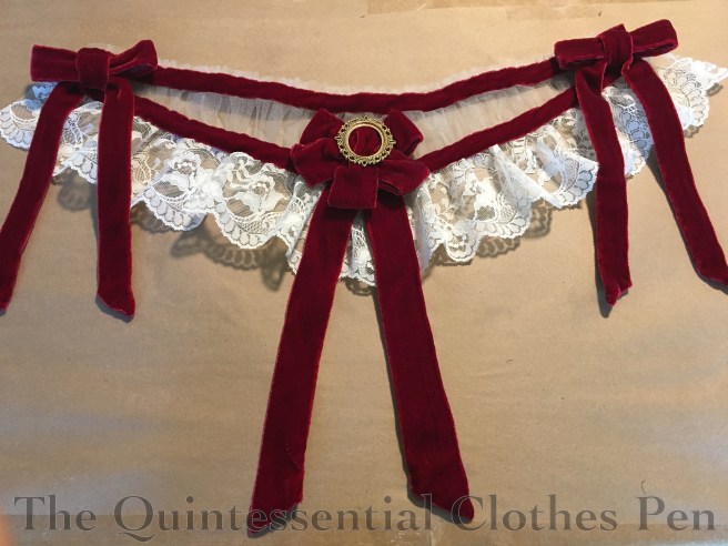 Remaking the bows (or rather, cutting new ones and disassembling ones I had already made) brings us back to where we were in the last post. The old velvet bows had top bow parts and dangling bow parts cut on the straight of grain, but due to my limited fabric I cut out the new bows with bias dangling parts. In the end I’m glad I did, because I think they hang more elegantly than the straight cut version.