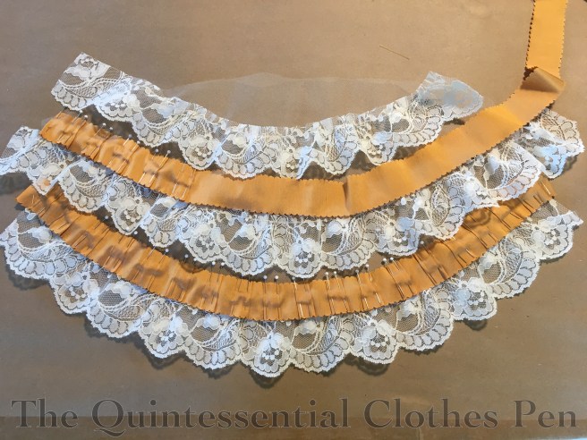 Sewing the lace on was easy and relatively fast, as I did it by machine. But the silk… well, I thought I had enough left over from my crazy skirt trimming for the sleeves but those pleats eat silk so quickly! I only had about 75% of what I needed.