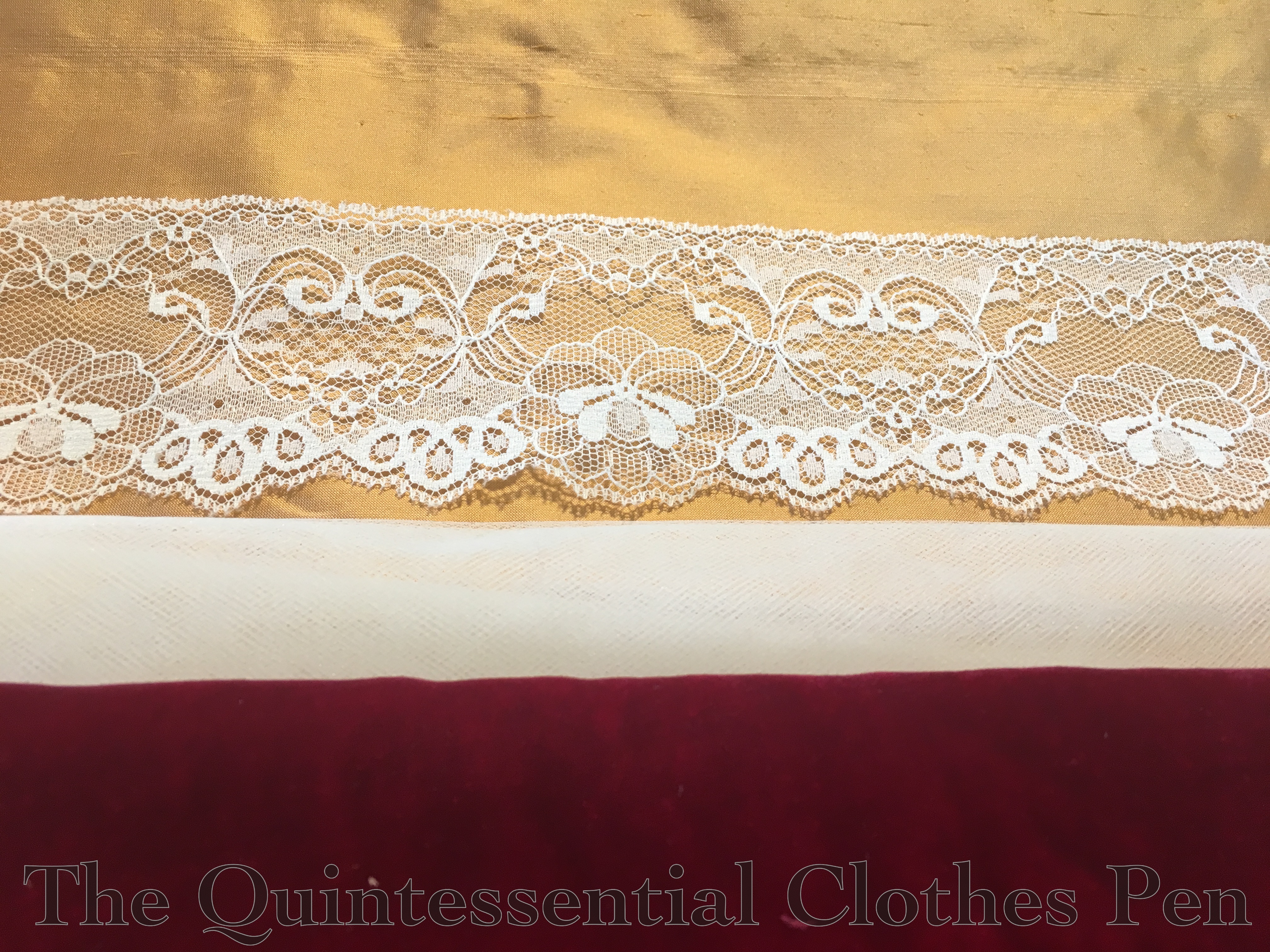 Sewing the lace on was easy and relatively fast, as I did it by machine. But the silk… well, I thought I had enough left over from my crazy skirt trimming for the sleeves but those pleats eat silk so quickly! I only had about 75% of what I needed.
