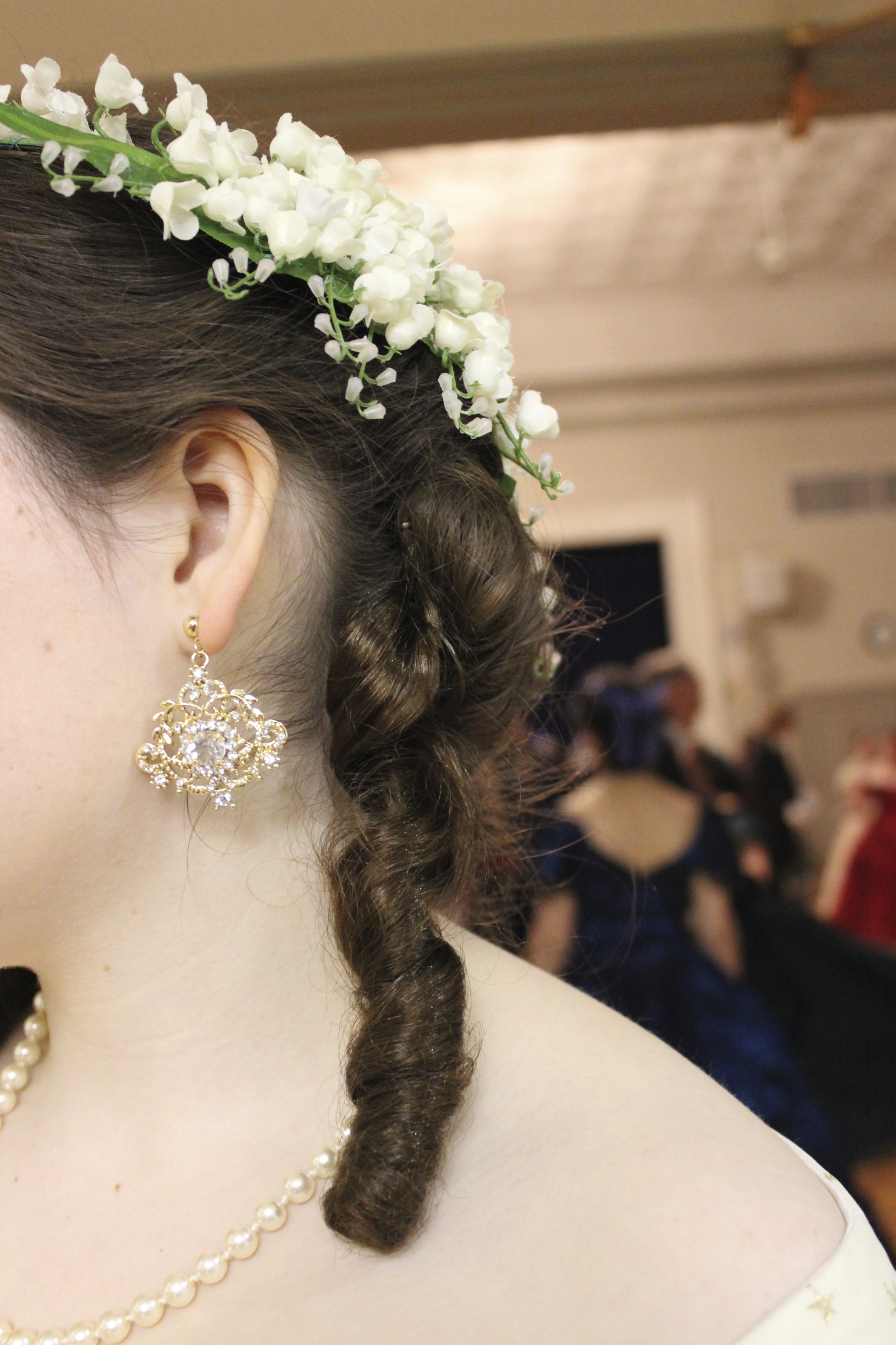 I tried to do something different than my usual 1860s style for this ball, and I must say that I like the results. The more you try out different hair styles, the easier they become! I’d brought my curling iron and I wanted to make use of it for this ball. (I have naturally curly hair, so it’s quite ironic when I use a curling iron. My curls are quite frizzy, a bit wild, and untamed rather than cork screw like, so the curling iron acts as a taming agent.) In the end I had two curls, one hanging on either side of my head. I wouldn’t do this for every ball, but it worked well with the amount of crazy bling I had and with the heavy quality of my dress.