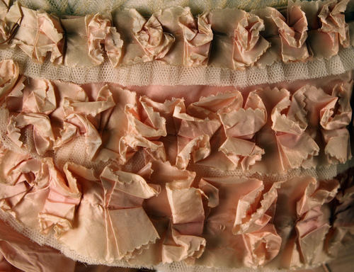 I also really love the trim! The scale of it is perfect for the 1860s, when trimmings occupied a large portion of the expansive skirts. The bertha and sleeves gracefully complement style of the dress, completing the look. The scalloped arrangement of trim on the skirt and the use of pleating to create the trim all add to my high opinion of this dress. Box pleating of this type was frequently used to adorn and trim garments in the 19th century, but this dress uses this trimming style to better effect than some. (There are close up pictures of the trim below.)