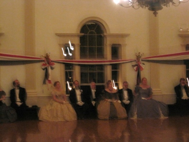 I have been dreaming of being in a room full of people all wearing crinolines and period menswear for years: the 1860s are my most favorite period! The night started out with all the ladies helping each other get dressed: lacing corsets, donning hoops and petticoats, fluffing skirts, and securing bodices. Of course, it does take some time to get dressed, so while we were dressing the band was warming up and the men were standing around looking important and discussing… well, who knows what?