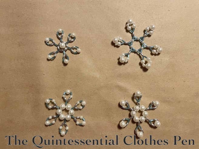 It was fun! For me, it was also a perfectionist rabbit hole! I wanted to find eye catching designs for the beads I had, make sure the beads were tightly pulled on the wire, make sure each area of each snowflake matched the other areas… There were many conditions to be met!