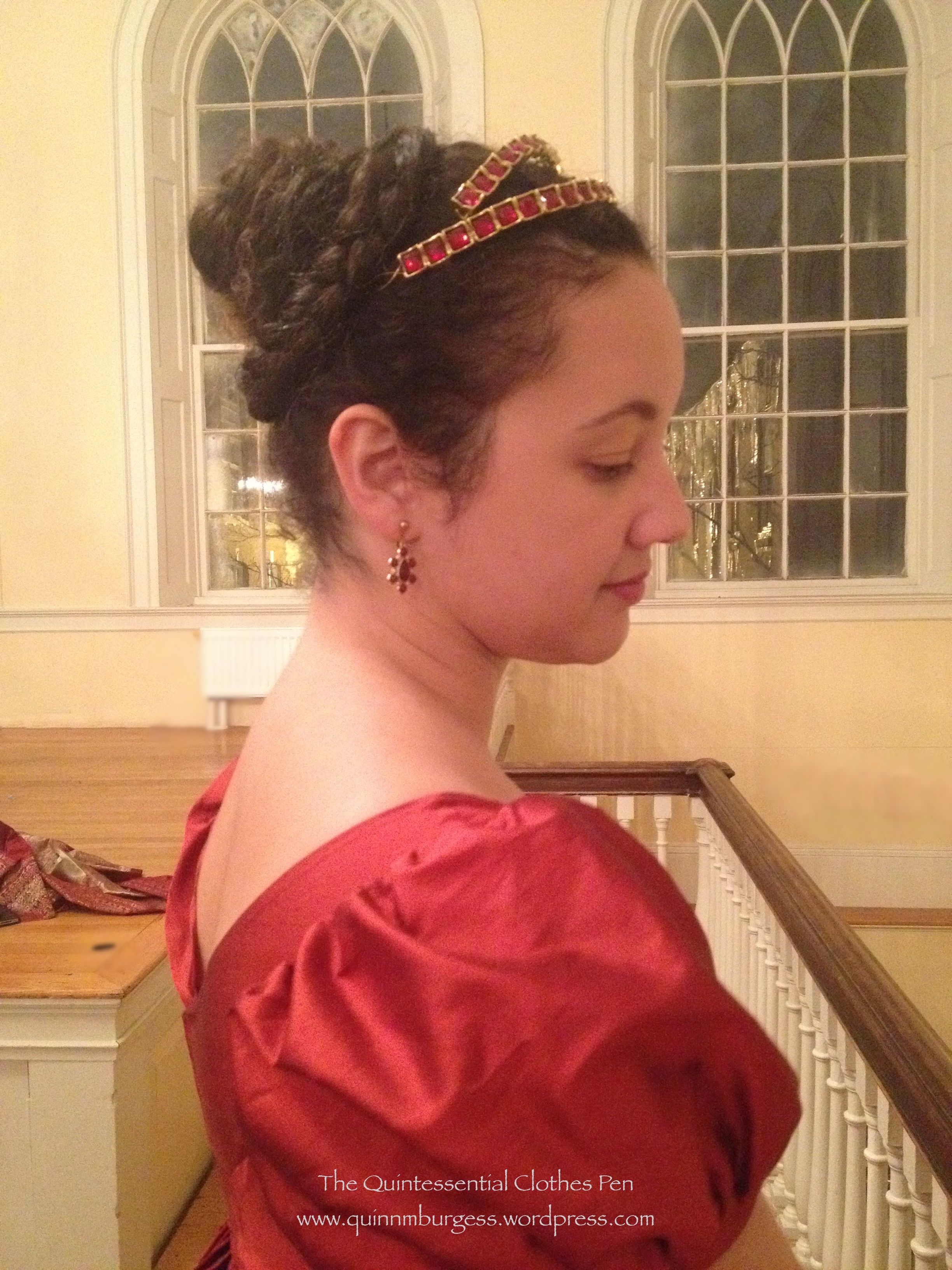 As you can see in the front view photo (above), I used a giant braid for the top/front of my style. There’s a whole blog post about how I created the braid here. Behind that, there is a bun form to help create volume on top of my head. This worked wonderfully for anchoring my hat pin, which you can just see poking out on the right side of the photo below–it’s tipped in a green glass leaf.