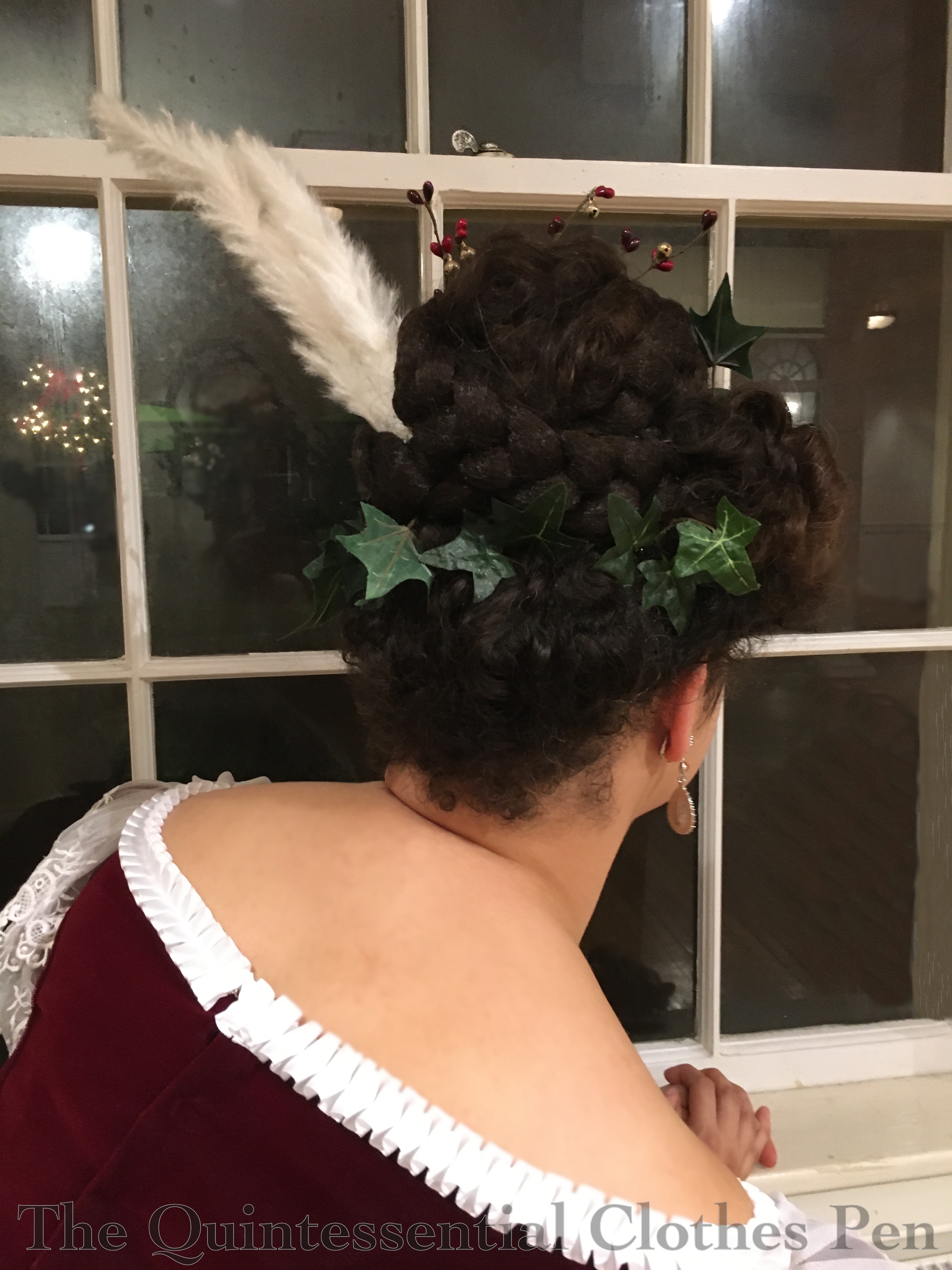 I attempted to create loops and swirls of hair around and below the bun, but I’m afraid that part of the style wasn’t as successful as I was hoping for. It’s difficult to do on the back of your own head and it’s hard to make the loops distinct, especially with my hair texture. I suspect it would be easier with smoother hair and definitely easier to do on someone else instead of yourself. I’ll have to try this style again some day. For this first attempt the back of my head was completely covered by my hat, so it doesn’t really matter what it looks like!