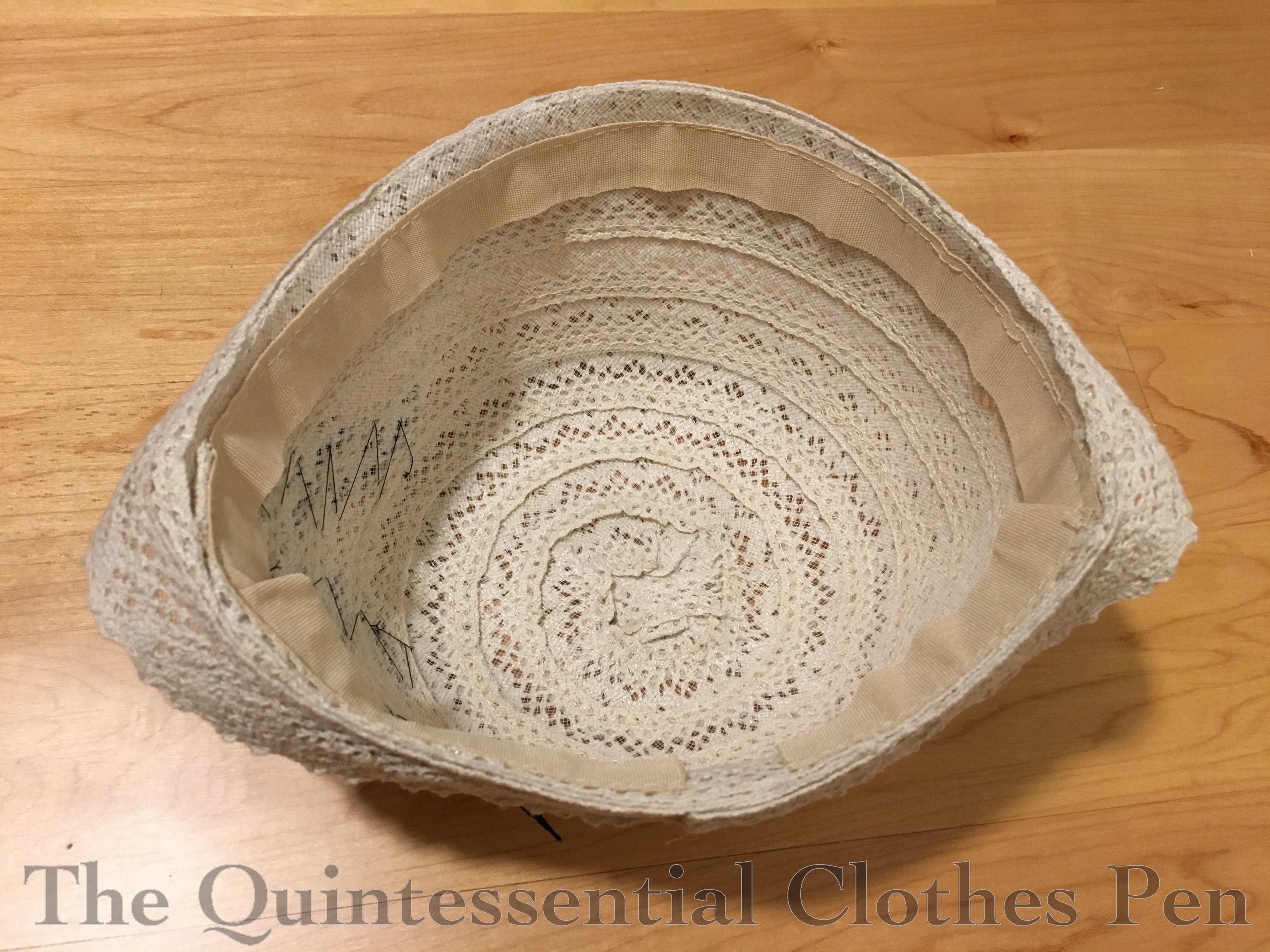 With my design plan in place, I started disassembling the modern cloche. First, I removed the braided band and flower. Then, I started unwrapping the lace on the brim, taking out the stitching that held one circumference to the next. I stopped at the bottom of the crown. I removed the inner hat band for most of the way around the hat, so I could stitch the new brim shape and the back cutout without stitching through the hat band.