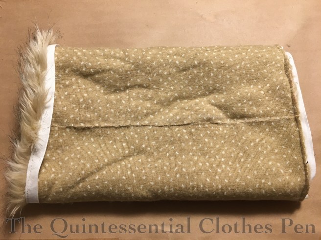 Accordingly, I measured my existing muff cover and cut a rectangle of faux fur that size. I butted my edge to make a tube and whip stitched it, in the same way as I whip stitched the mantle trim. Next, I machine sewed twill tape on the tube ends. (I had no worries about the fur getting caught in the machine sewing because that whole edge turns into the muff in the end anyway, so none of that will show.)