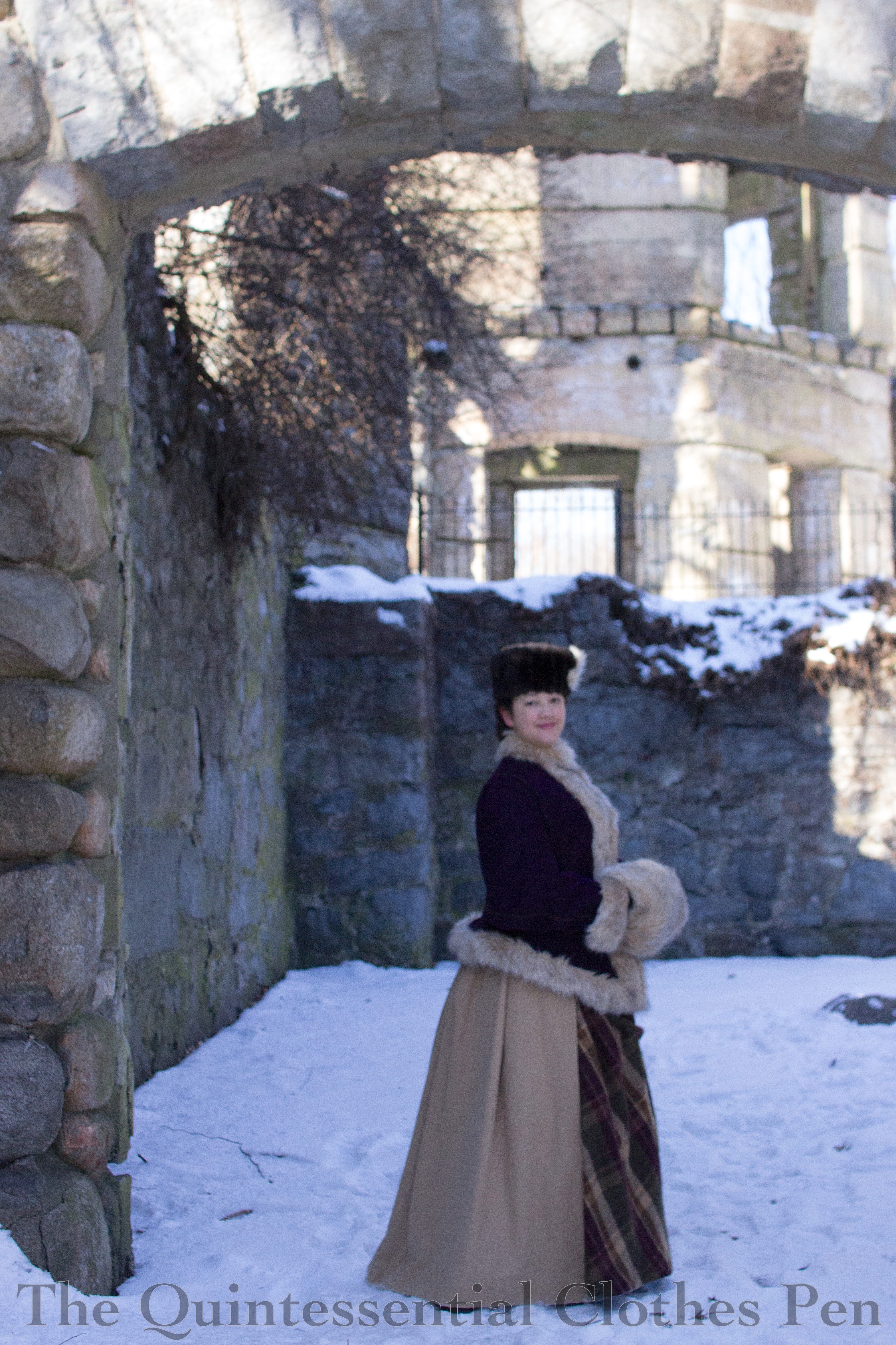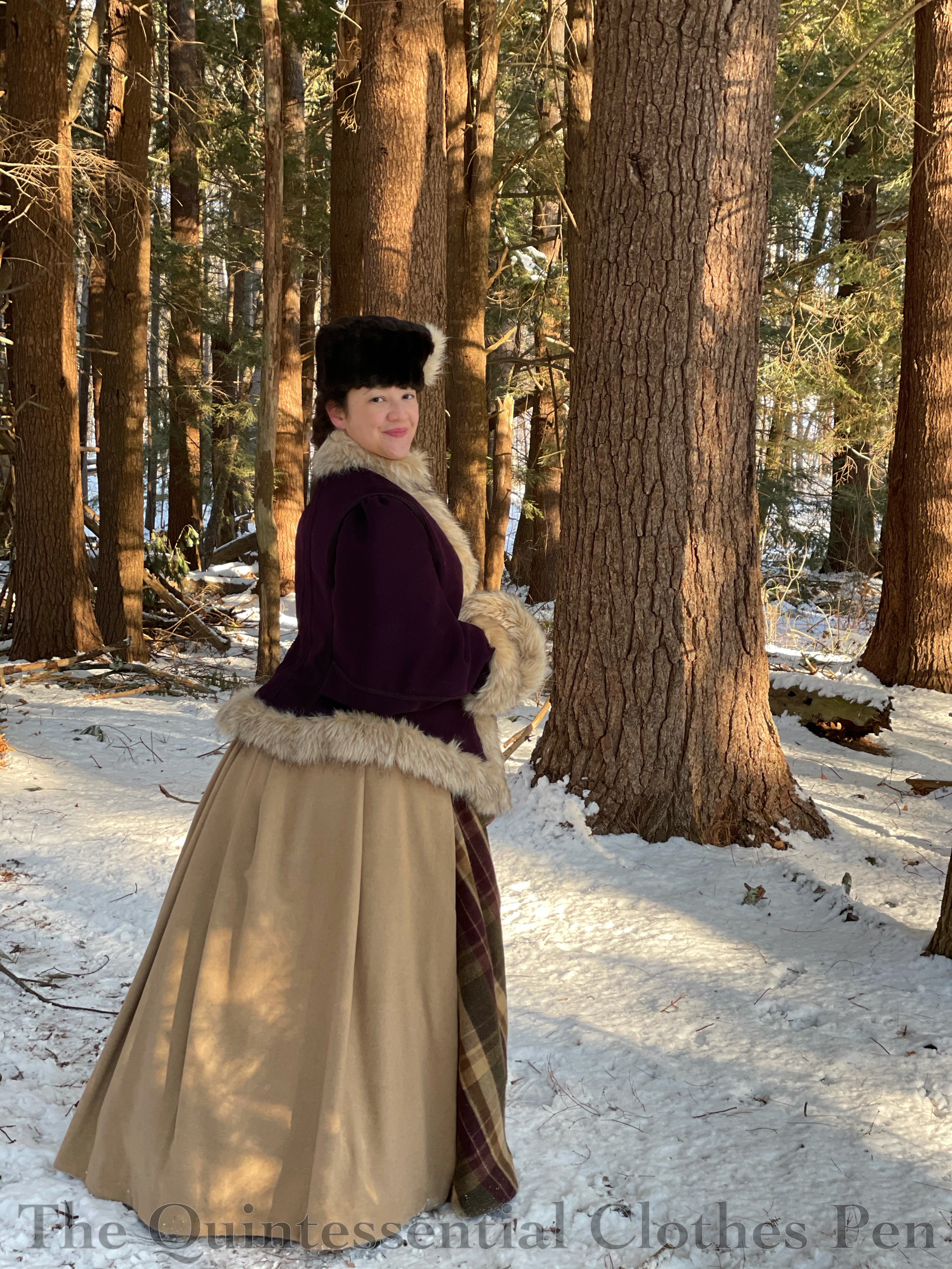 Last post was a detailed look at the 1884 Plaid Wool Bustle Dress that I completed last year. This post is going to look at the details of the accessories I made and wore to stay warm while taking photos of the 1884 dress: a mantle, a new muff cover, and a quick mention of the hat.