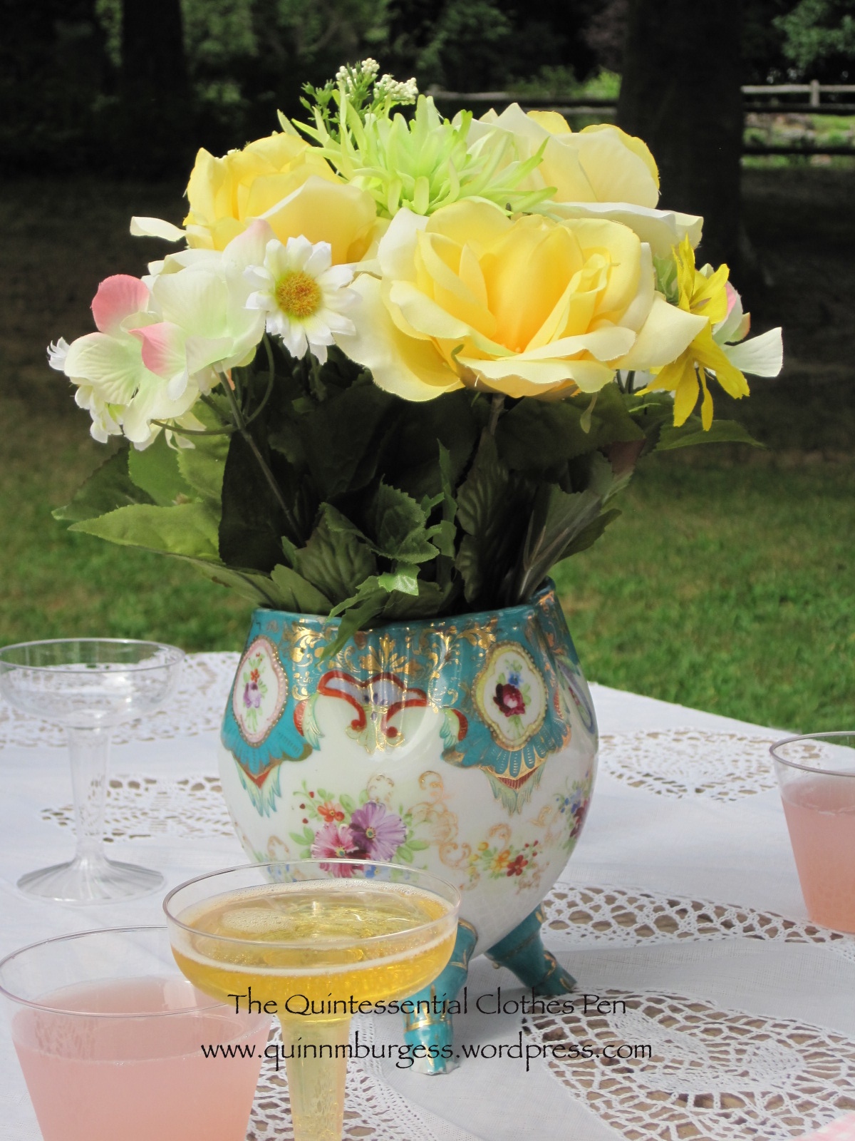 To back up to the beginning, though, the game followed food eating time at the picnic. We had a pretty elaborate picnic set-up with vases, and silver, and vinyl lace table cloth…
