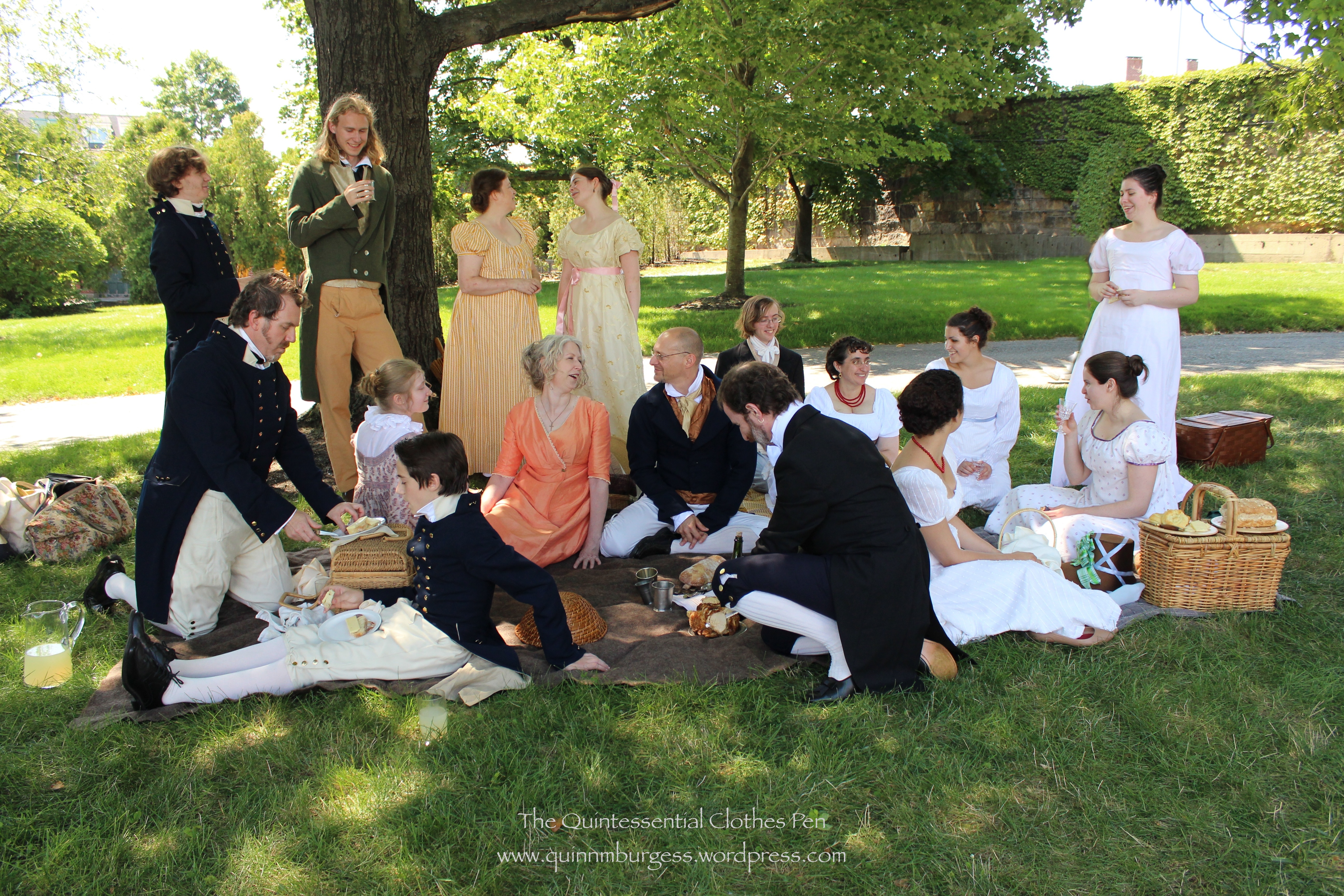 So picturesque! This could totally be out of a Jane Austen scene.Group shot. I wore my 1815 Tree Gown and bonnet, accessorized with a sapphire cross necklace, my stripe-y reticule, blue American Duchess stockings, and pointy tan shoes.I didn’t bring a fan, but the other ladies did. Aren’t they all lovely?