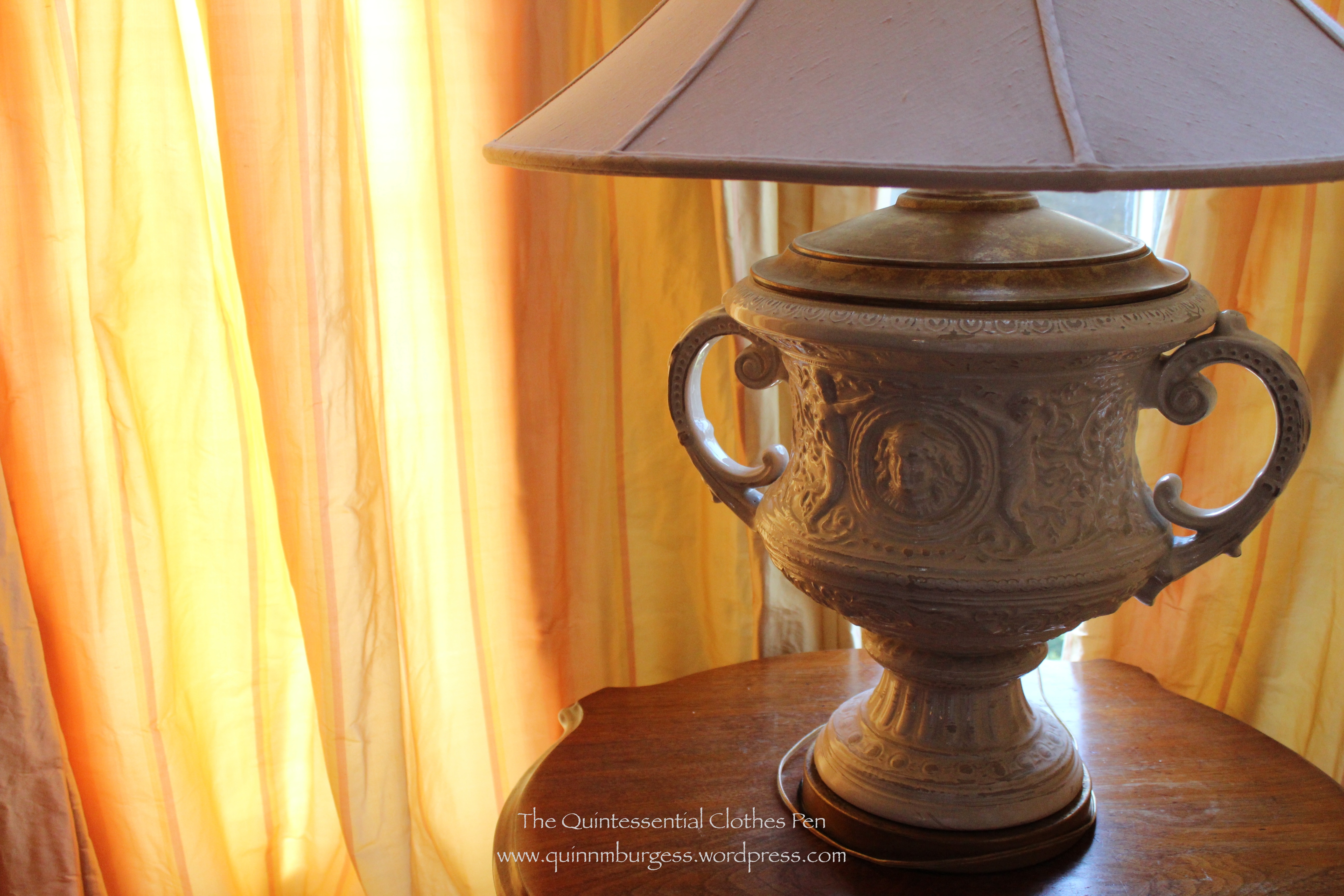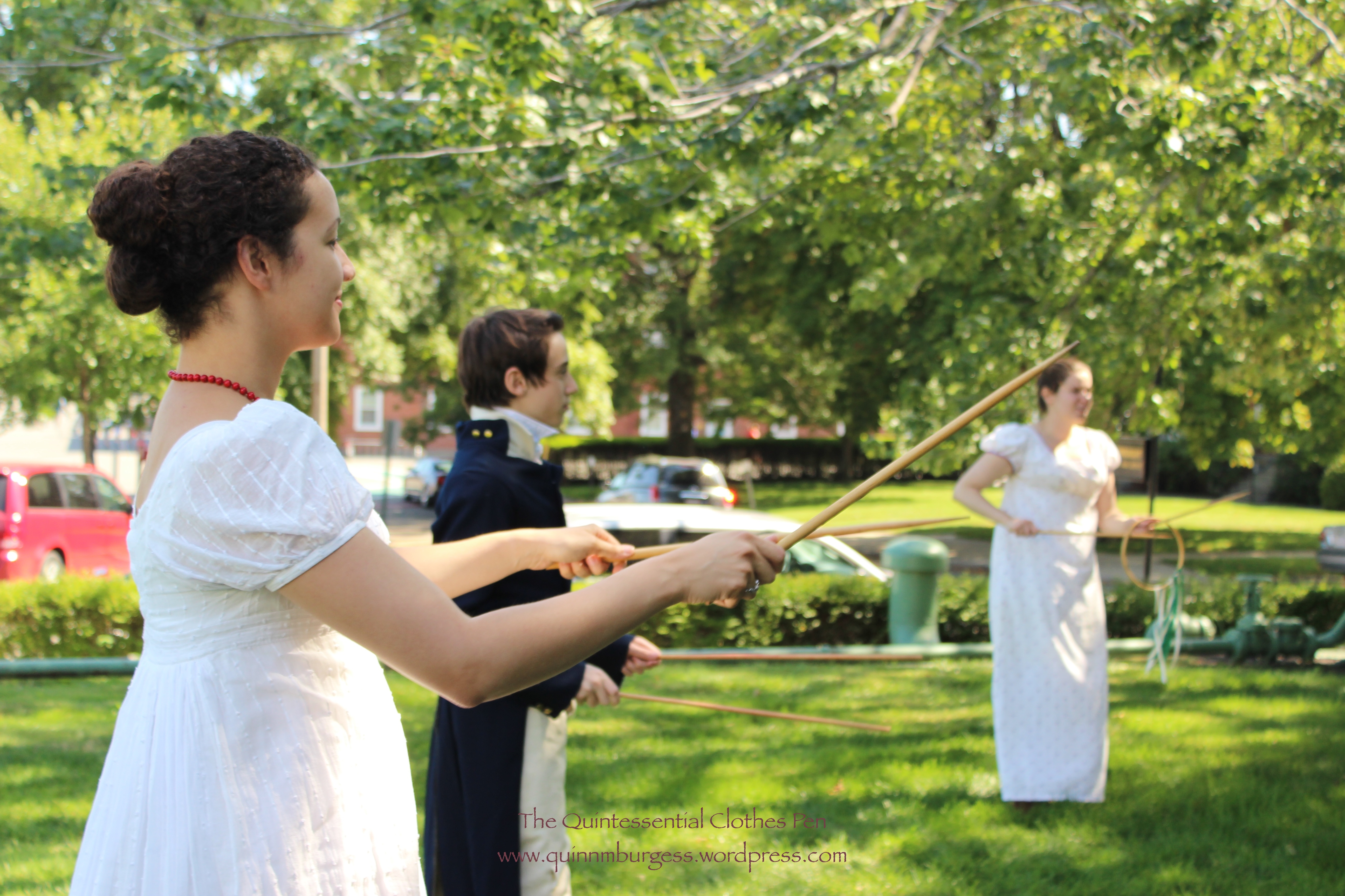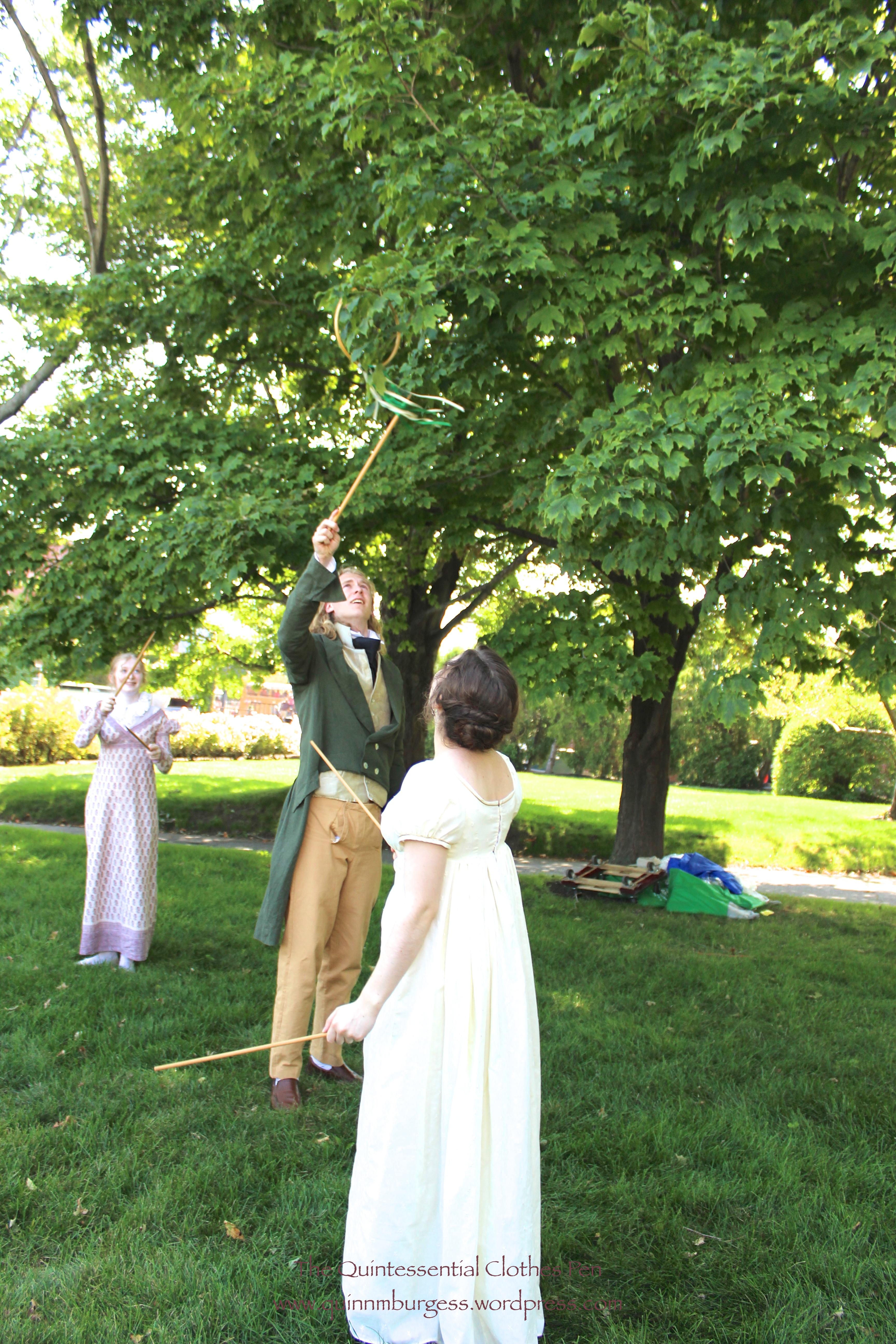 I love how picturesque we all look in this photo! It’s sort of funny how the white dresses all clumped on one side and the colored dresses on the other.After eating we played Graces.It’s much more fun with lots of people and lots of hoops!We played it in a big circle and would just call someone’s name to get their attention (hopefully) before flinging the hoops at them.There were some really good catches and really close misses.We had a great time and laughed a lot!With trees around, I’m sure you can guess what happened…I didn’t want to do a boring bun, so I opted for two rolls of hair instead.We were called from Graces to dance inside the house. I was particularly appreciative of this wallpaper this time around. It’s in the entry hallway. You can see other interior pictures of the house in this post from last year.The curtains in this room have a lovely glow when the sun shines on them.Looking for Mr. Darcy, perhaps? I just love the shadows and the glow.