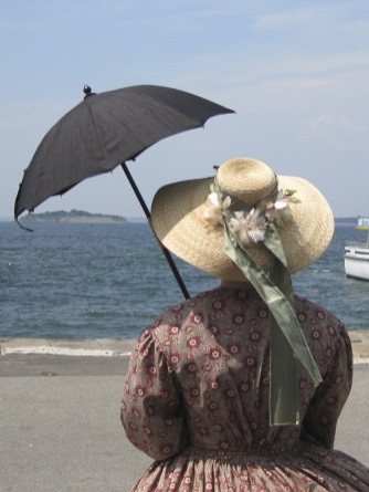 I decided on a simple brown band to trim the hat. I had the brown cotton in my stash and it matched my shoes well. It is nicely complimentary for the outfit without being match-y and it’s neutral enough that I can easily wear this with other outfits as well. The brown is carefully hand sewn around the crown with the ends spreading over the brim of the hat. Ta da! Elegant sun protection!