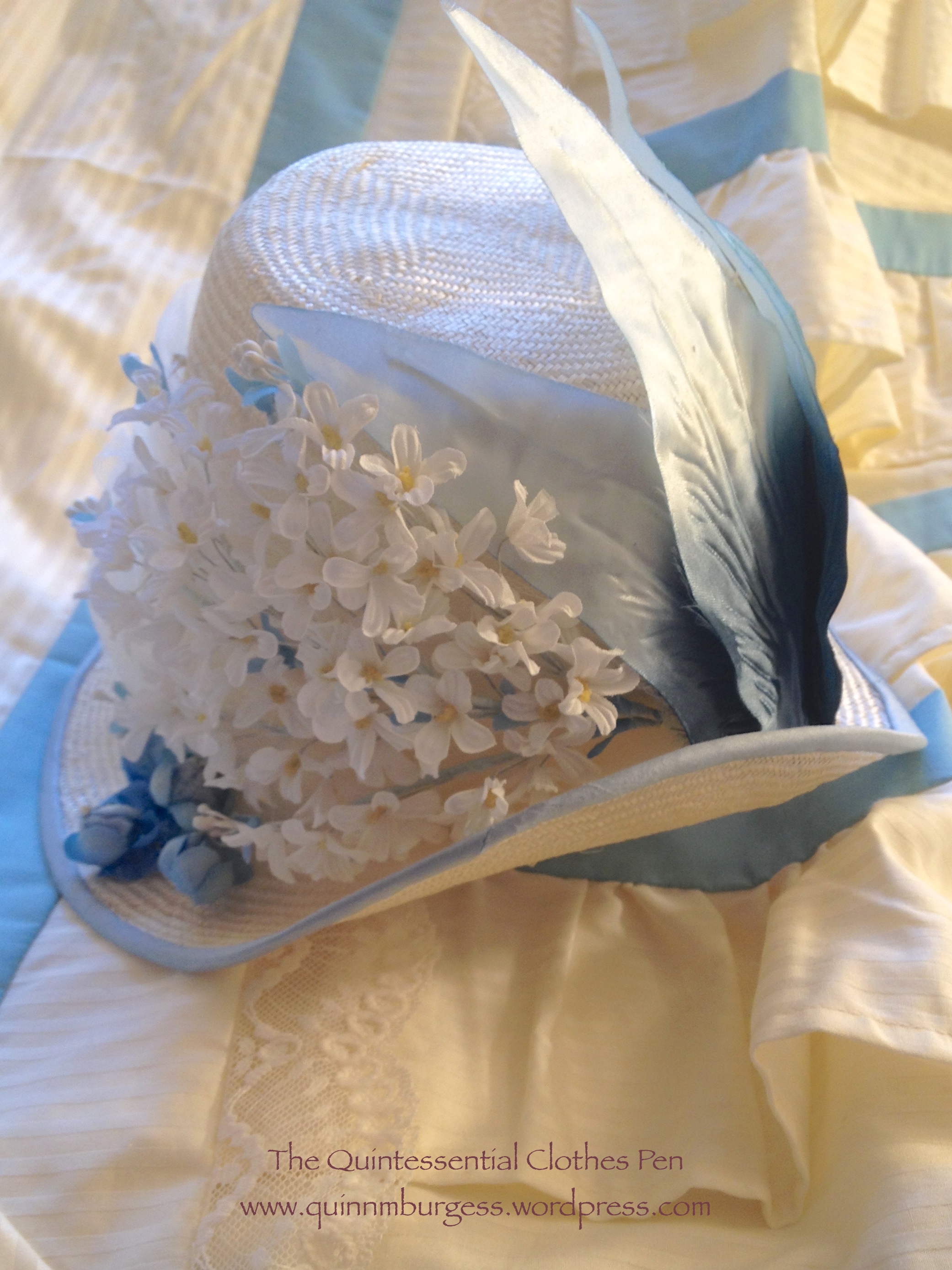 While trying to decide what to accessorize my 1933 dress with, I looked at the hat in my closet and wondered if there was anything to be done to make it better. I figured the white would coordinate well with the white stripes in the dress fabric. I looked for hat inspiration on my 1930s sportswear Pinterest board and 1930s day wear Pinterest board and decided that the main problem with my hat was the tall crown. I wanted a hat that just perched on my head, so I needed to shorten the crown.