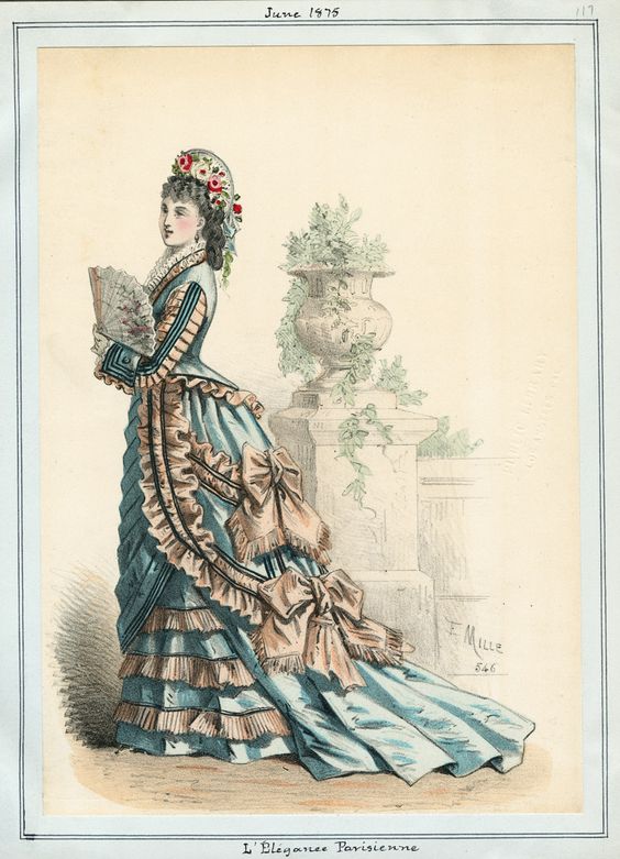 Skirts from this period are often confections crafted from fabrics and trims–and this one is no different. The inspiration came from a fashion plate from L’Elegance Parisienne (June 1875) that is held by the LAPL.